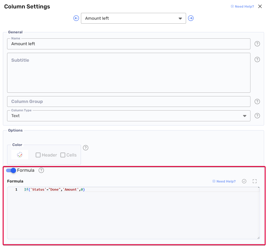 - Vous pouvez afficher une formule comme un pourcentage, un texte coloré ou toute autre capacité de mise en forme de RowShare. Créez une colonne avec les options d'affichage de votre choix, puis dans ses paramètres, activez l'option "Formule".
